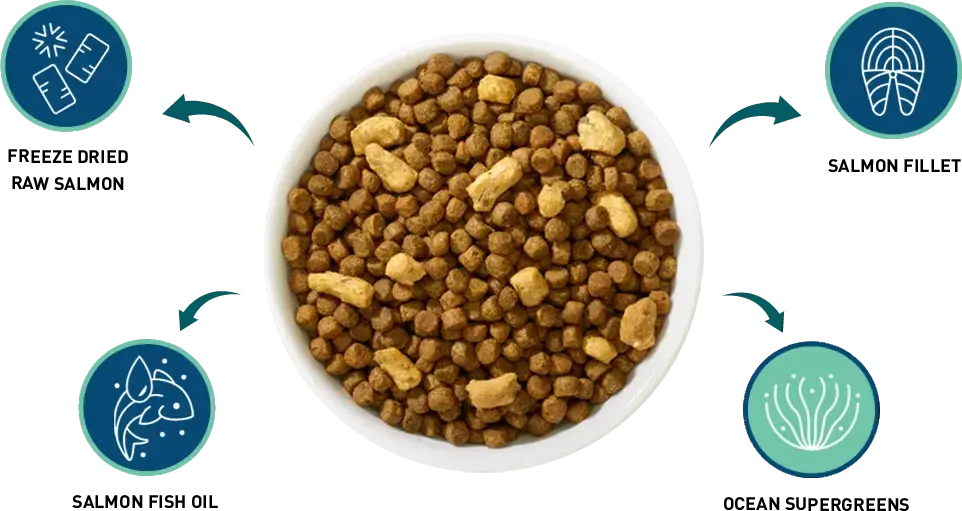 Deboned Salmon, Salmon Meal, Pea Protein, Salmon Oil (Preserved with Mixed Tocopherols), Garbanzo Beans (Chickpeas), Green Lentils, Dried Yeast Protein, Natural Flavor, Tomato Pomace, Salt, Dried Pumpkin, Potassium Chloride, Marine Micro-algae Oil, Taurine, Dried Blueberry, Dried Cranberry, Dried Carrot, Dried Apple, Kelp, Inulin, Vitamins (Choline Chloride, a -Tocopherol Acetate (Source of Vitamin E), Niacin, L-Ascorbyl-2-Polyphosphate (Source of Vitamin C), Thiamine Mononitrate (Source of Vitamin B1), Menadione Sodium Bisulfite Complex (Source of Vitamin K), Vitamin A Acetate, Pyridoxine Hydrochloride (Source of Vitamin B6), Calcium Pantothenate, Riboflavin Supplement, Biotin, Vitamin B12 Supplement, Vitamin D3 Supplement, Folic Acid), Minerals (Ferrous Sulfate, Zinc Amino Acid Chelate, Zinc Sulfate, Iron Amino Acid Chelate, Copper Sulfate, Sodium Selenite, Copper Amino Acid Chelate, Manganese Sulfate, Manganese Amino Acid Chelate, Calcium Iodate), Dried Enterococcus faecium Fermentation Product, Dried Lactobacillus acidophilus Fermentation Product, Dried Lactobacillus casein Fermentation Product, Dried Lactobacillus plantarum Fermentation Product, Rosemary Extract