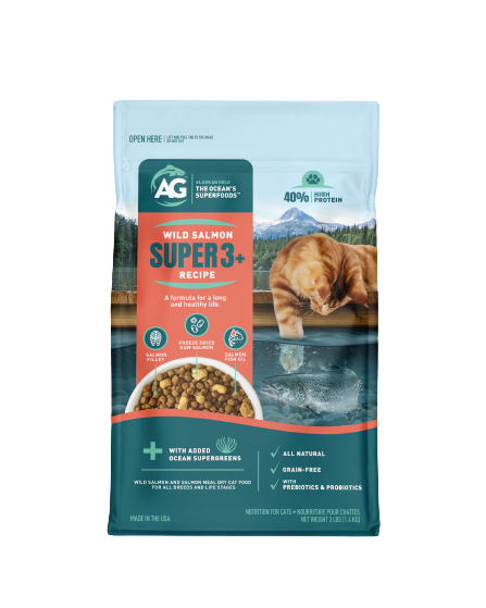Alaskan Gold™ Wild Salmon Super3+ Cat Food is a complete and balanced meal, for all breeds and life stages that uses Alaskan Salmon as the only protein ingredient paired with freeze dried raw Salmon and fortified with salmon oil, a terrific source of Omega-3 fatty acids. This Super3+ formula benefits your cat’s whole body helping promote skin and coat, immune, heart, muscle, joint and brain health.