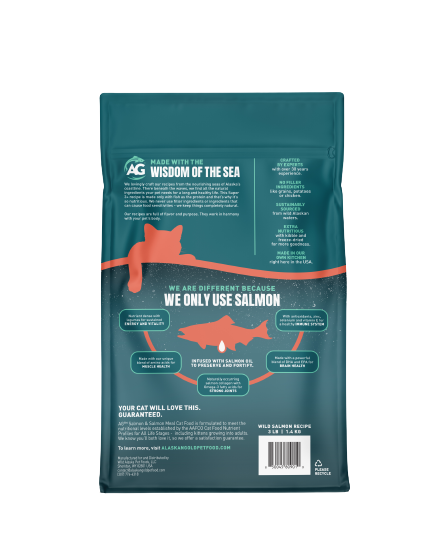 AG Salmon & Salmon Meal Cat Food is formulated to meet the nutritional levels established by the AAFCO Cat Food Nutrient Profiles for All Life Stages, including kittens growing into adults.